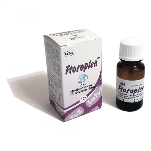 Фторлак Ftoroplen (0531) от украинской торговой марки Latus применяется в терапевтической стоматологии. Фасуется во флаконы весом 12 г. Препарат имеет лаковую структуру, легко наносится, остается на зубах от 2 до 5 дней.