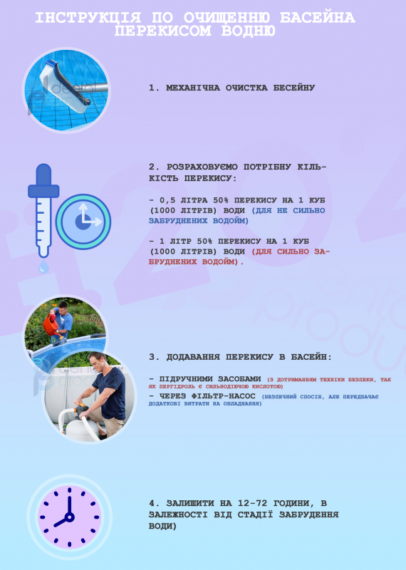 - стандартная очистка, соотношение: на 1 м3 воды 0,5 л перекиси;