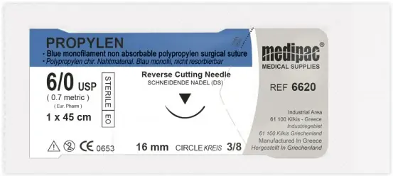 Шовный материал хирургического назначения Medipac Propylen изготовлен из пропилена и имеет голубой оттенок. Монофиламентная стерильная нить рассчитана на одноразовое применение, неиспользованные остатки подлежат утилизации.