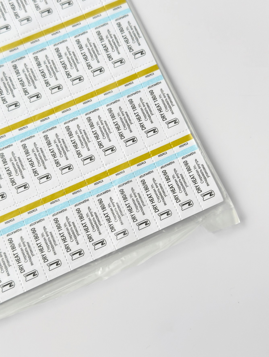 • липкий слой на обратной стороне индикатора облегчает его закрепление на стерилизуемых упаковках и вклеивание в документы архива;