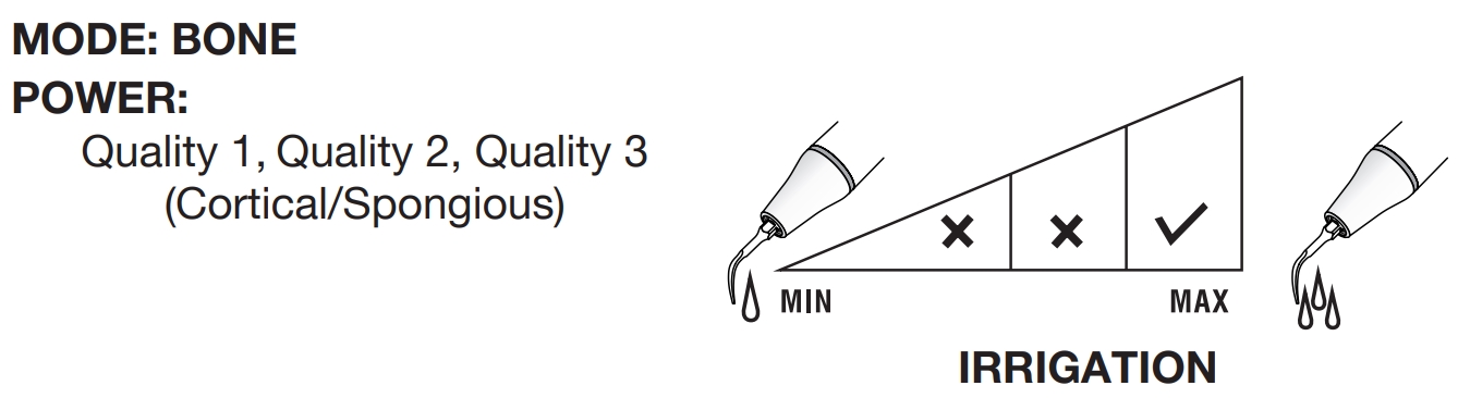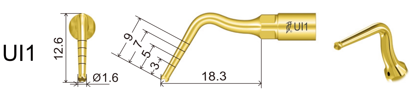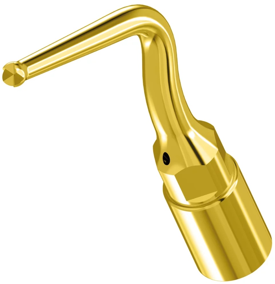 Основное назначение данной насадки - подготовка костных тканей к имплантации. Изогнутая рабочая часть заканчивается шарообразной головкой диаметром 1,6 мм. Специальные сплошные насечки на высоте 3мм, 5мм, 7мм и 9 мм обеспечивают специалисту визуальный контроль над глубиной погружения в кость пациента. Центральная часть насадки имеет отверстие, подающее к препарируемым тканям воду. Таким способом достигается эффективное охлаждение тканей во время работы и обеспечение видимости операционного поля.