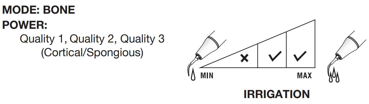 Используется хирургический инструмент при проведении финишных работ на участке костной имплантации (вблизи альвеолярного нерва). Для защиты тканей от перегрева предусмотрена эффективная водяная система охлаждения, которая также способствует отличной видимости операционного поля.