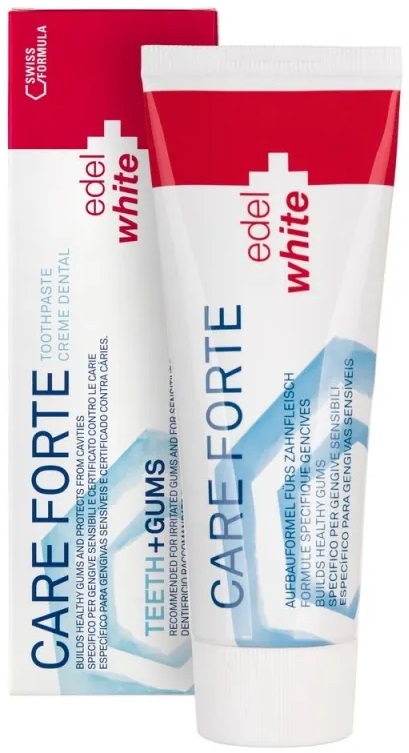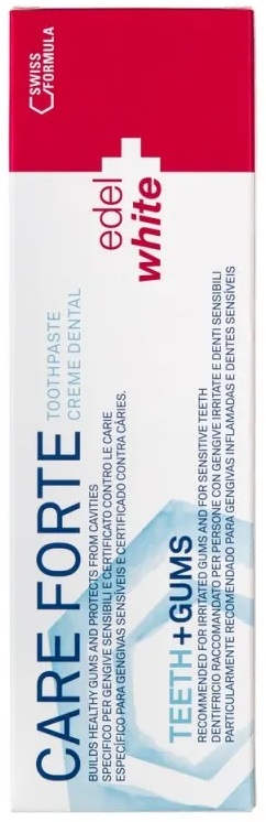 Зубная паста EDEL + WHITE® "Активная защита десен" защищает и укрепляет десны. Научно разработанная швейцарскими учеными и запатентованная формула пасты в своем составе содержит: лактат алюминия, лактат кальция и водный раствор пищевой соды: