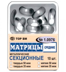 Матрицы металлические секционные предназначены для разделения аппроксимальных поверхностей соседних зубов при реставрации II типа. Все матрицы - объемные, вогнутые, сформованы из специальной коррозионностойкой стали. Изготавливаются из специальной коррозионностойкой стали толщиной 35 или 50 мкм.