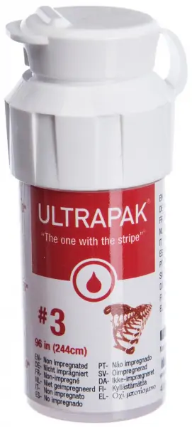 Ретракционная нить без пропитки Ultradent Ultrapak разработана для использования в терапевтической, ортопедической и эндодонтической стоматологии. Ретракция десны проводится в различных клинических случаях. Изделие выполнено на 100% из хлопка, имеет узелковую структуру, благодаря чему удобно и безболезненно ложится в зубо-десневую борозду и стабильно в ней удерживается.