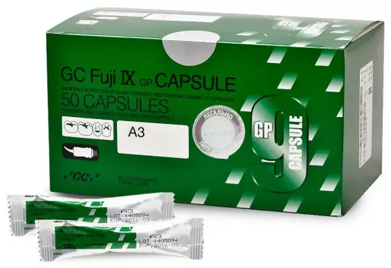 Капсулированная версия стеклоиономерного цемента FUJI IX GP Capsules выпускается японской компанией GC, применяется в современной стоматологии при восстановлении жевательных, боковых и молочных зубов (полости 3 и 5 класса). Материал не текучий, консистенция пакуемая, вносится в полость одномоментно, хорошо моделируется. Химический способ полимеризации обеспечивает затвердение материала за 2 мин., рабочее время увеличено до 1 мин. 15 сек.