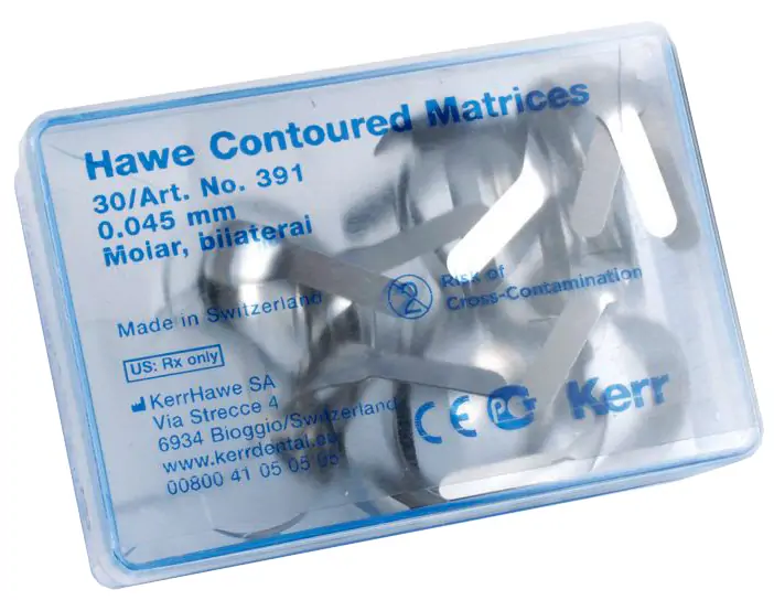 KerrМатрицы контурные Kerr Hawe Contoured Matrices (в наборе 30 шт.) используются в реставрационной стоматологии при восстановлении верхних и нижних премоляров и моляров.