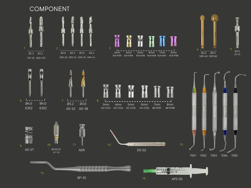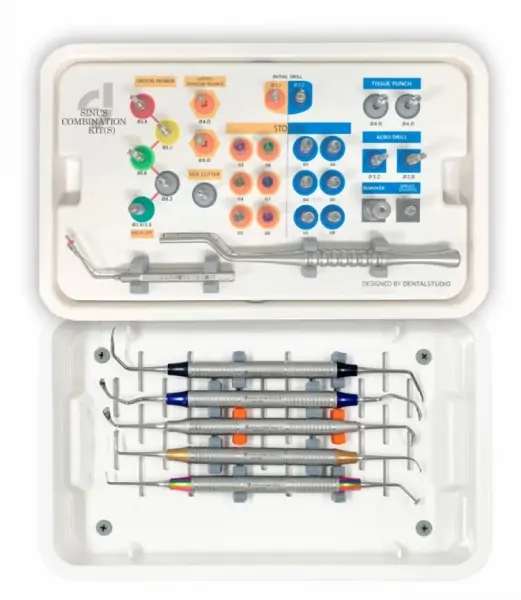 Полный набор инструментов для проведения как хрестального так и латерального синуса лифтинга.