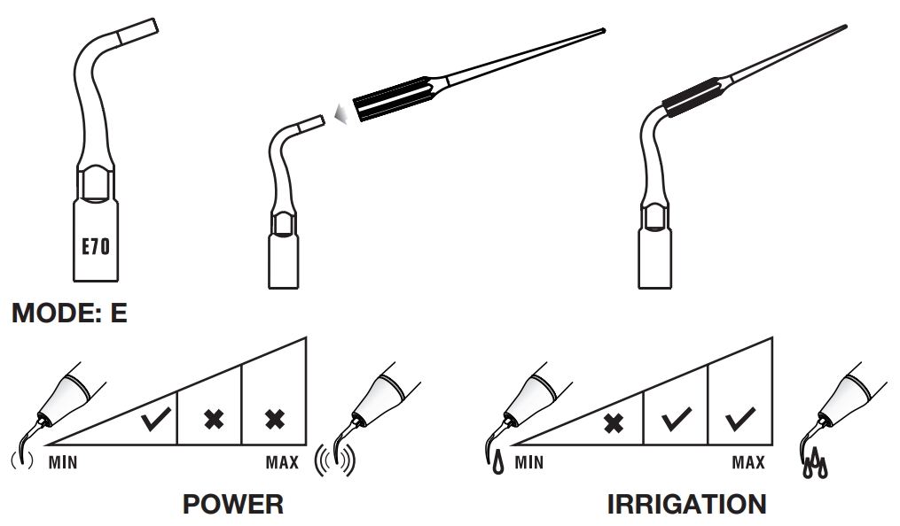 Эндочак, используется для установки E71, E72, E73 или E74 для очистки корневых каналов или ирригации. Уровень мощности 1-3 в режиме E ультразвукового скейлера. Используется для ирригации корневых