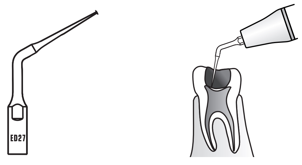 Завершение обработки полости пульпы и удаление кальцификации на дне пульповой камеры. Кончик наконечника имеет форму круглой присоски, а режущий эффект исходит от края присоски. В осевом направлении режущий эффект отсутствует, что позволяет избежать перфорации дна пульповой камеры.