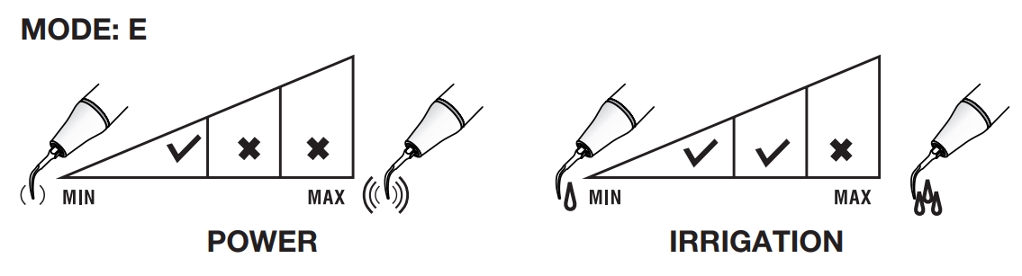 Уровень мощности 1 в режиме лечения корневых каналов (режим E) Поместите наконечник на активную часть и приложите небольшое усилие вдоль осевого направления конца наконечника. При работе без воды следуйте режиму «Работайте в течение 5~10 секунд, затем остановитесь на 2 секунды». Открывайте воду каждые 60 секунд для охлаждения и промывания.