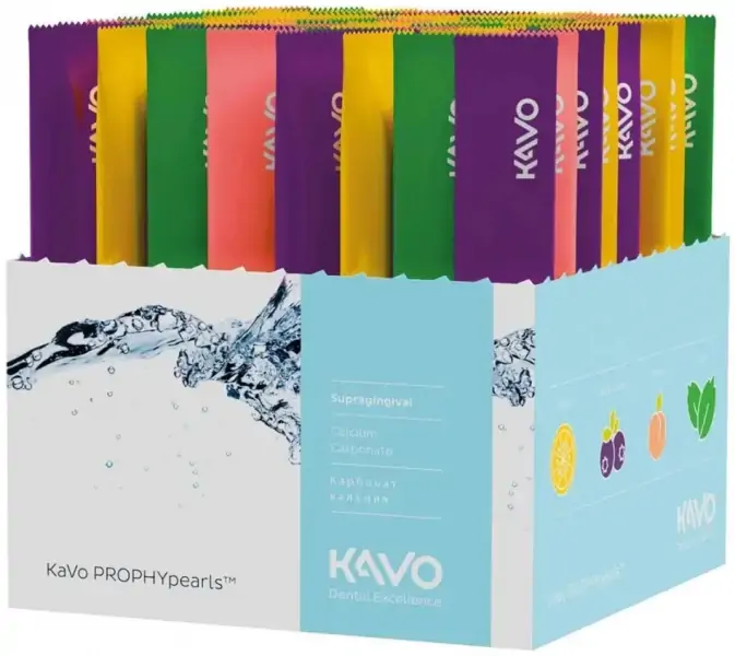 Порошок KAVO PROPHYpearls (расфасовка в одноразовых стиках, в наборе 20 стиков по 15 г) имеет нейтральный вкус и предназначен для проведения различных очистительных процедур в условиях стоматологического кабинета. В основе препарата лежат карбонат кальция и глицин. Гигроскопичный порошок имеет округлую форму гранул (их размер варьируется от 60 до 70 мкм), благодаря чему достигается мягкая чистка поверхностей в щадящем режиме. Данный метод идеально подходит для чистки зубов у пациентов с гиперчувствительностью. Длится процедура около 30 минут, частота проведения чистки не должна превышать 1 раза за 6 месяцев.