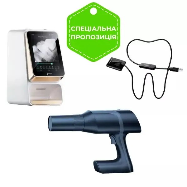 - В комплект входит Портативный рентген, Визиограф, Сканер фосфорных пластин