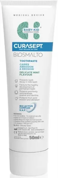 CuraseptЗубная паста Biosmalto CARIES ER, ABR BABY KID STRA AUNZ, (CS-02391) от итальянского бренда Curasept, разработана для самых маленьких детей, возрастом от 6-ти месяцев до 6-ти лет. Приятный и освежающий мятный вкус способствует привыканию малыша к проведению ежедневных гигиенических процедур. Уникальный состав пасты защищает незрелую детскую эмаль от кислотных эрозий, останавливает истирание эмали, защищает от кариеса.