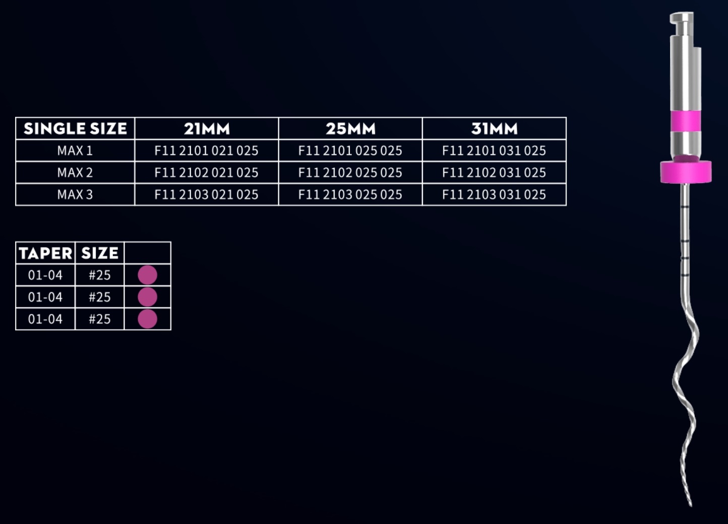 Технічні характеристики AF MAX3, 25 мм, конусність 01-04 (FANTA) Машинні файли, NiTi, 3 шт (три вигини)