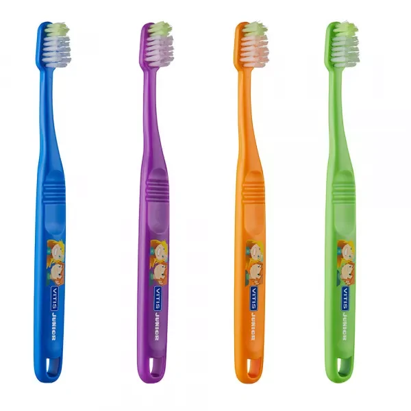 DENTAID VITIS JUNIOR - ручна зубна щітка з м'яким ворсом призначена для дітей віком від 3-х років. Компактна рукоятка щітки зручно лягає як у дитячу, так і в дорослу руку. М'які ворсинки делікатно очищають бактеріальний та зубний наліт з ніжної емалі та ясен дитини, не пошкоджуючи їх.