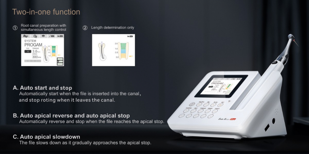 - • 2 в 1 : препарування каналу з одночасним контролем довжини препарування завдяки вбудованому апекслокатору