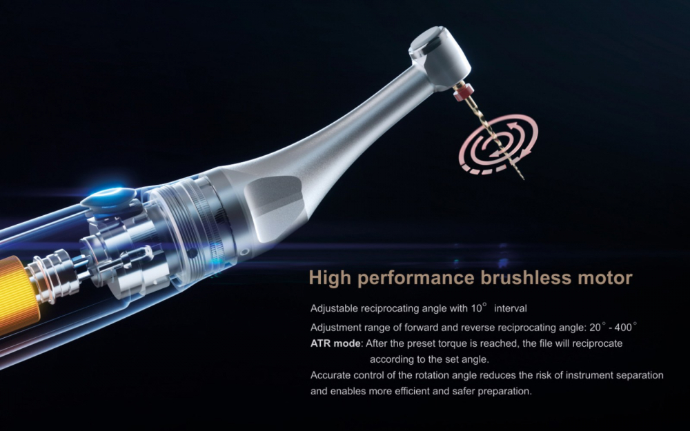 - • Налаштування кута при реципрокній роботі: 20 - 400º, з кроком 10º. Точне регулювання кута обертання зменшує ризик поломки інструменту, забезпечуючи безпечне препарування.