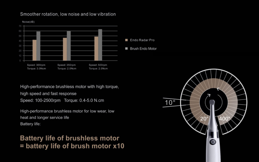 Endo Radar Pro – це високопродуктивний бездротовий ендодонтичний мікромотор, розроблений для забезпечення максимальної точності, ефективності та безпеки під час обробки кореневих каналів. Він поєднує в собі потужний безщітковий мотор, вбудований апекслокатор, розширений діапазон швидкостей та ряд інтелектуальних функцій.