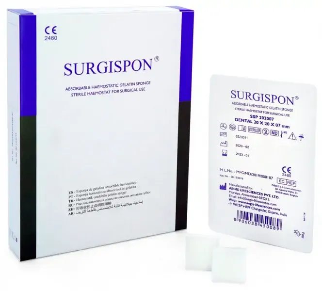 Виробником гемостатичної стерильної губки Surgispon є індійська компанія SURGISPON. Виріб призначений для використання в різних областях хірургії, в тому числі і в хірургічній стоматології при проведенні різних процедур, пов'язаних з пошкодженням тканин, середніх та великих судин та капілярів, що потребують екстреного гемостазу. Залізоподібний матеріал дозволяє миттєво зупинити венозну/капілярну кровотечу в зонах, де немає можливості накласти лігатуру або скористатися іншими кровоспинними способами.