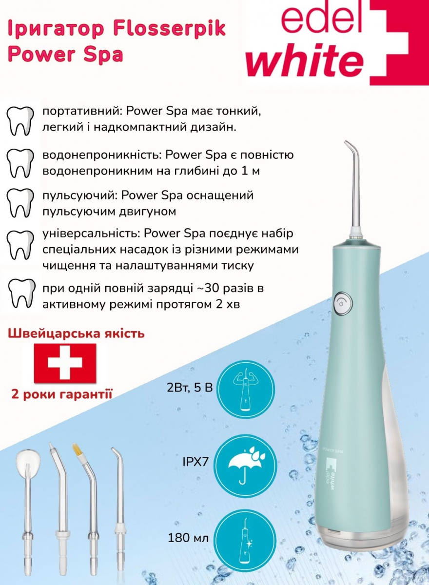 Технічні характеристики Іригатор Edel+White Flosserpick Power Spa WJ180 (7640131971713)