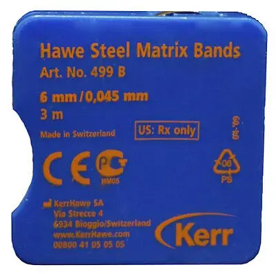 KerrМеталева матрична стрічка Kerr Hawe Steel Matrices Bands (товщина виробу 0,045 мм) розроблена американською компанією Kerr. Стрічка широко застосовується в терапевтичній/реставраційній стоматології при відновленні зубів верхньої/нижньої щелепи.