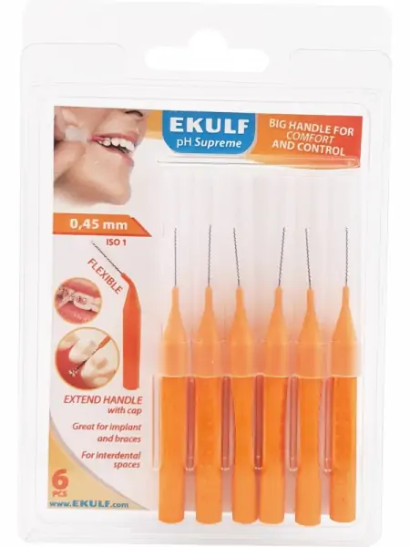 Щітки для міжзубних проміжків Ekulf Ph Supreme розроблені шведськими фахівцями для людей, яким необхідна рукоятка більшого розміру для комфортного утримання інструменту в процесі чищення. Кожна щітка має гігієнічний захисний ковпачок, за допомогою якого можна збільшити довжину ручки інструменту.