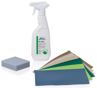 Набір укомплектований розчином для дезінфекції FD 360 у флаконі об'ємом 0,5л і десятьма спеціальними губками для видалення бруду. Флакон оснащений зручним розпилювачем.