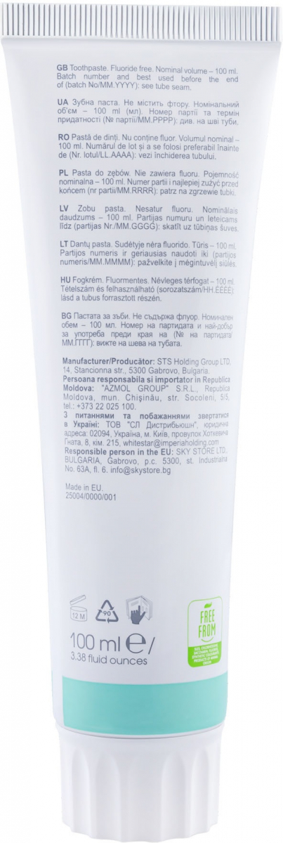 - Склад Aqua, Hydrogenated Starch Hydrolysate, Dicalcium Phosphate Dihydrate, Hydrated Silica, Glycerin, Cellulose Gum, Sodium Coco-Sulfate, Aroma, PVP, Calcium Hydroxyapatite, o-Cymen-5-ol, Papain, Stevia Rebaudiana Leaf Extract, Juglans Regia Leaf Extract, Helianthus Annuus Seed Oil, Menthyl Lactate, Citrus Limon Peel Oil, Chamomilla Recutita Flower Oil, Pullulan, Acacia Senegal Gum Extract, Tocopherol, Ascorbyl Palmitate, Xanthophylls, Mannitol, Limonene.