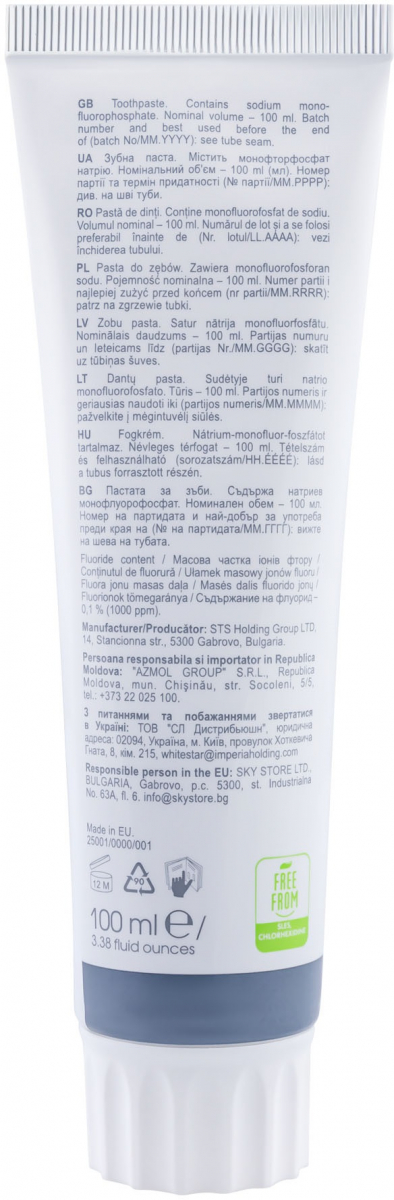 - Склад Aqua, Hydrogenated Starch Hydrolysate, Hydrated Silica, Dicalcium Phosphate Dihydrate, Potassium Nitrate, PEG-8, Calcium Pyrophosphate, Pentasodium Triphosphate, Aroma, Sodium Coco-Sulfate, Cellulose Gum, Sodium Monofluorophosphate, CI 77891, Sodium Lauroyl Sarcosinate, PVP, Sodium Methylparaben, Sodium Saccharin, Menthol, Papain, Mannitol, Limonene. Fluoride content – 0,1 % (1000 ppm)